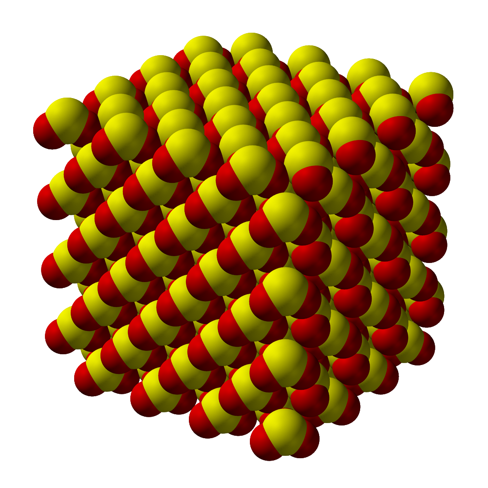 Sulfur Dioxide is a molecular solid, made of sulfur dioxide molecules which are covalently bonded with one lone pair which makes it a bent shape. However, the solid is held together with dipole-dipole force due to its polarity.